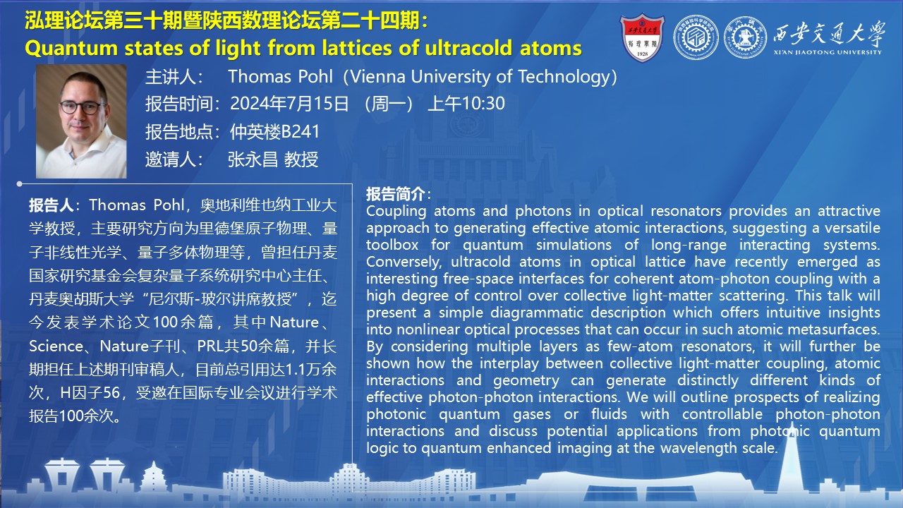 【泓理论坛第三十期暨陕西数理论坛第二十四期】——Quantum states of light from lattices of ultracold atoms