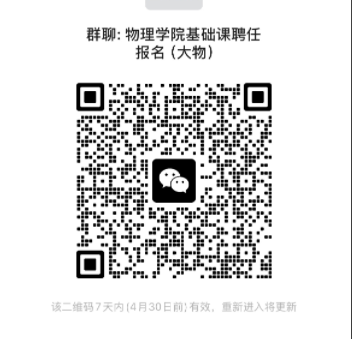 4月27日前,将电子版《个人简历》(格式不限,须包含个人基本信息、授课经历等主要信息)发至邮箱:elle119@xjtu.edu.cn。同时,报名的老师请扫描二维码加入大学物理授课报名微信群: