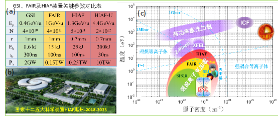 图1、(a)重离子加速器大科学装置GSI, FAIR及HIAF关键参数对比;(b)国家“十二五”大科学装置HIAF鸟瞰图;(c)不同装置或设备可探索的高能量密度物态区域。