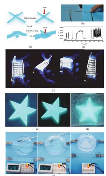 (a)基于离子凝胶的电容式压力传感器示意图。(b)实物照片。 (c)不同压力刺激下电容变化与时间的关系曲线。(d)基于离子凝胶的柔性LED器件片。 (e)离子凝胶电致发光器件的照片,原件(左),在空气中存放1个月后(右)。 (f)基于水凝胶的电致发光器件的照片(在空气中储存1天后)。 (g)离子凝胶电缆在水环境中处于不同温度下。
