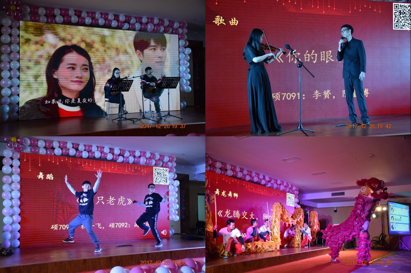晚会节目形式丰富多样、内容丰富,其中包括优美的舞蹈、歌曲串烧、流行歌曲、配乐诗朗诵、尤克里里和吉他弹唱、南箫演奏、舞龙舞狮等共16个节目。现场气氛异常热烈,台下观众激情飞扬,掌声不断,一片欢声笑语。由工会主席王红理和实验中心俞晓红两位老师朗诵的《大树西迁》将我们带回当年的西迁场景,老师们的朗诵声情并茂、感人肺腑;由博化班贾孟军、刘博奥两位同学带来的一首乐器弹奏歌曲《追光者》和由陈鑫博及硕7091班李贇带来的《你的眼神》,充满着浪漫与清新甜蜜,诠释着幸福的真谛;硕7091杜一飞和硕7092高伊扬带来别致的舞蹈版《两只老虎》,将帅气和幽默完美融合,点燃了全场观众的热情;由硕6066李娜、7091吴雨帆和郭健带来的中西合并的歌曲串烧,随着欢快的音乐旋律,活力十足,碰撞出青春的火花,充满青春的气息;以《龙腾交大,狮哮长安》为主题的舞龙舞狮伴随着锣鼓声,生动活泼、时而飞腾跳跃、时而入海破浪,画龙点睛之笔满载全体师生对新年的祝福和期望;由栗生长老师带来的南箫独奏《枉凝眉》,婉转悠扬,似静似动,似流水潺潺;由钟渊、马胜利、强蕴蕴老师分别演唱的单曲《等待》、《今生共相伴》、《女儿情》各具特色,让每一部音乐背后的故事更生动鲜活;还有一曲民谣《成都》,清新而温暖,仿佛置身成都街头,让观众如痴如醉沉浸其中;而硕7092的朗诵《如果我在交大遇见你》,带我们走遍交大的每一个角落,是交大生活点滴的缩影,感情充沛细腻,勾起大家的无限回忆;理学院的任洁茹、杨欣玥、王迪等老师们带来优美的舞蹈,其中杨欣玥老师个人独舞《印度舞》洋溢着异域风情,群舞《凉凉》古典优雅,赏心悦目;晚会最后以赵凌儒同学演唱的《空城》圆满收尾,整场晚会给理学院全体师生带来了一场无与伦比的视觉盛宴。
