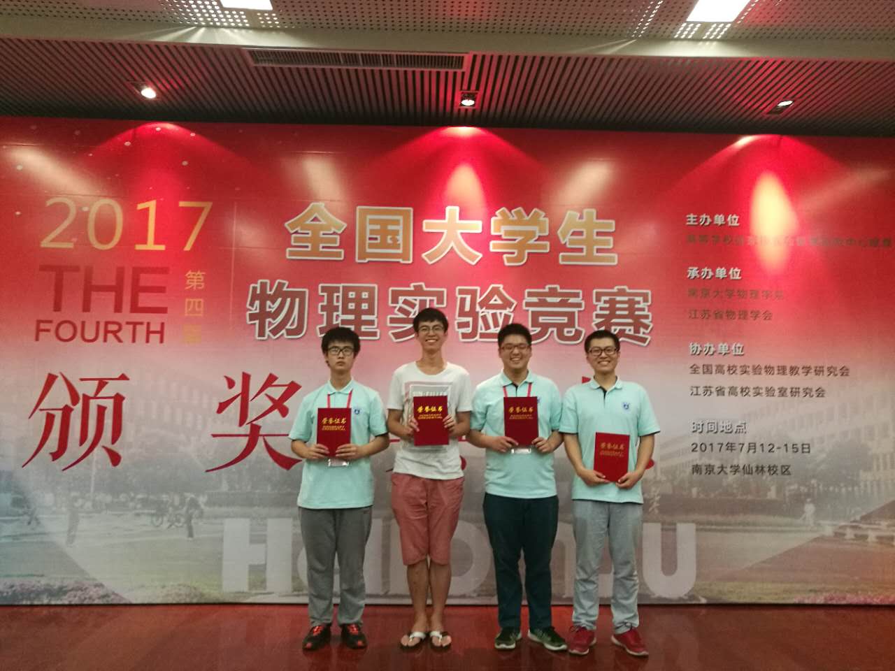 2017年7月12日至15日在南京大学举办的第四届全国大学生物理实验竞赛中,我校参赛的四位同学全部获奖,物试51班车一卓获得基础类竞赛二等奖,光信息41班张时语,应物41班黑鑫磊和林暐晋分别获得基础类和综合类竞赛三等奖。指导教师张俊武,王红理,王雪冬。