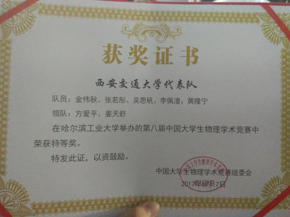 第八届中国大学生物理学术竞赛日前在哈尔滨工业大学举行,来自北京大学、清华大学、浙江大学等73所高校的74支代表队经过四天的激烈角逐,共决出特等奖5项、一等奖10项、二等奖22项、三等奖37项、个人奖15项,西安交通大学代表队参赛师生经过近10个月的精心准备与不懈努力,在竞赛中以严谨的科学态度、扎实的理论功底、巧妙的实验构思、机敏的论辩思维、默契的团队协作赢得评委专家的认可和好评,首次获得特等奖,并进入决赛,在决赛中,西安交大代表队继续发挥出色,获得第三名的历史最好成绩。金伟秋同学获“最佳反方奖”。