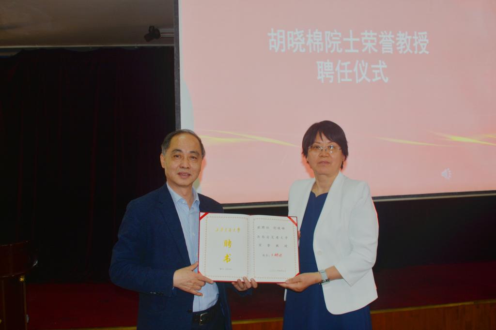 荣命哲向胡晓棉院士颁发西安交通大学荣誉教授聘书,并为胡院士佩戴校徽。