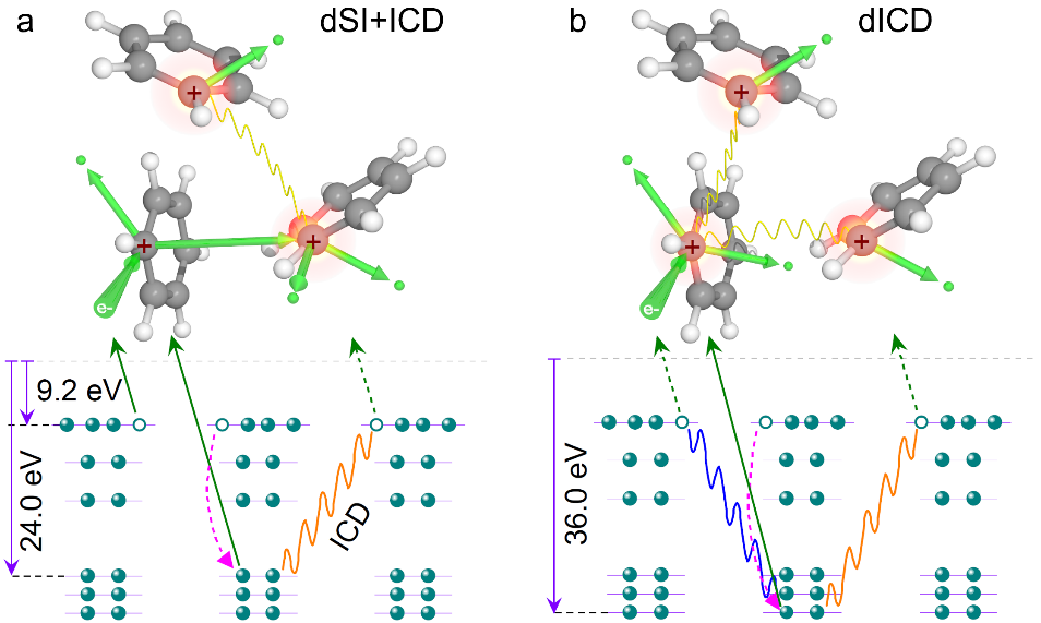 图(a)电子束诱导苯三聚体次序电离诱导分子间库仑衰变(dSI+ICD)过程;(b)苯三聚体分子间双重库仑衰变(dICD)过程。