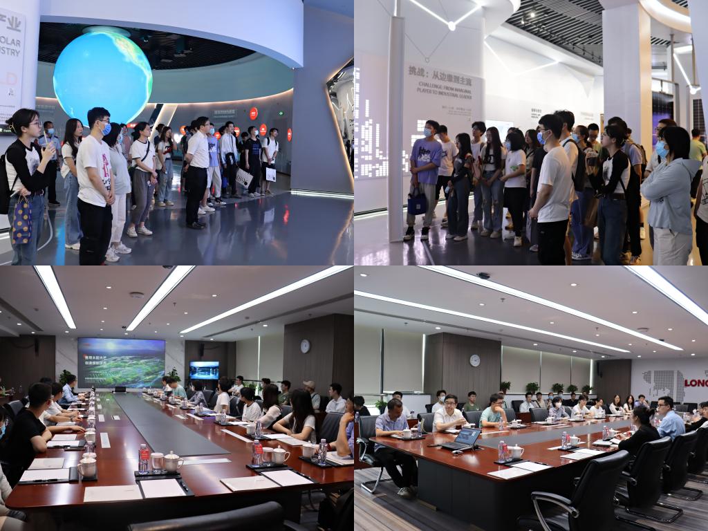 同学们首先参观了隆基绿能智慧能源展览馆,展览馆包含向“阳”而生、21世纪能源亟需“进化”、隆基洞察时代的智慧、光伏驱动智能星球和尾厅五个部分。让大家不仅可以零距离触及能源的过去、现在和未来,还可以详细了解隆基的发展史,纵览光伏行业变革的历史缩影。展厅里陈列的光伏电池展品、各种场景应用解决方案以及“零碳工厂”的建设发展历程,让同学们感受到了光伏新能源产业的独特魅力。