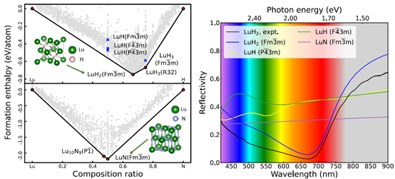 左图:对比大量Lu-H以及Lu-N化合物的形成焓,并结合其它计算结果,确认了氮掺杂镥氢材料的主成份为LuH2(Fm-3m),次成份为LuN(Fm-3m)。右图:通过计算反射谱,并对比实验测量结果,解释了氮掺杂镥氢材料在压强增加时的复杂颜色变化。