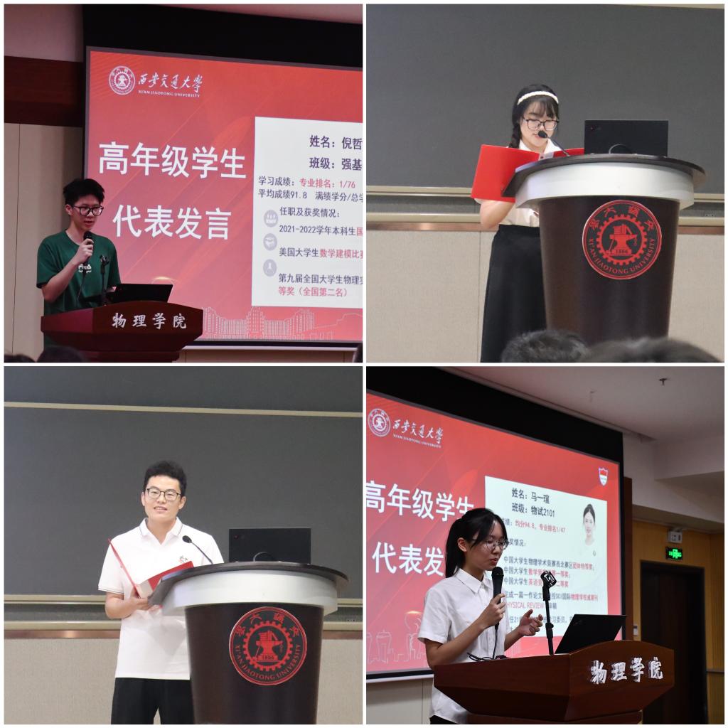 本科生代表马一瑄、倪哲文分享了自己学习和参加竞赛活动的体会。硕士生代表陈佳琪以自己跨专业的经历告诉大家学科交叉学习的重要性,博士生代表马步博建议同学们科学规划时间,大量阅读综述文献,主动与导师交流,同时应积极参与学生工作。