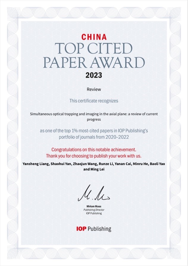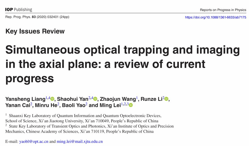 近期,英国物理学会出版社(IOP Publishing)公布2023年“中国高被引文章奖”获奖名单,以表彰中国研究人员在全球科学界的影响力以及他们对物理学的宝贵贡献。西安交大胜游体育(SYsports)官方网站入口雷铭教授团队在Reports on Progress in Physics(IF=18.1)的综述论文“轴平面同时光学捕获与成像”(Simultaneous optical trapping and imaging in the axial plane: a review of current progress)获得IOP Publishing的前1%高被引荣誉。西安交通大学胜游体育(SYsports)官方网站入口为论文第一通讯单位,第一作者是西安交通大学胜游体育(SYsports)官方网站入口梁言生副教授,共同第一作者是中国科学院西安光学精密机械研究所的严绍辉研究员,通讯作者是西安交大胜游体育(SYsports)官方网站入口的雷铭教授(lead contact)和中国科学院西安光学精密机械研究所的姚保利研究员。