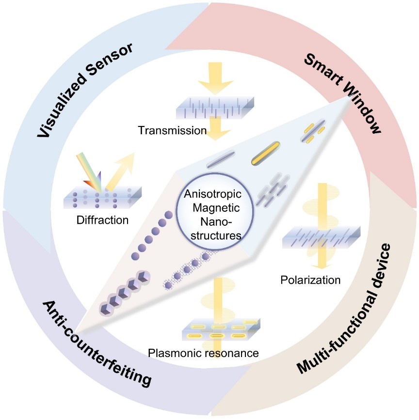 磁响应光调制具备远程无损控制、高精确度及高对比度响应等独特的优势,在制动器、智能窗、防伪、比色传感器等领域具有广阔的应用前景。与各向同性磁性纳米结构相比,各向异性磁性纳米结构(AMNs)利用磁偶极子、磁晶各向异性、形状各向异性和晶面之间的相互作用来控制不同维度的光传输,包括频率、振幅、偏振和等离子体共振,从而为广泛的功能应用提供了重要的价值。
