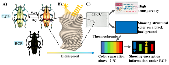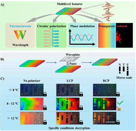 针对这一问题,西安交通大学胜游体育(SYsports)官方网站入口研究人员与新加坡南洋理工大学合作,从仿生的角度,通过从甲虫独特的变色能力和偏振特性中获取灵感,开发出一种兼具透明、热致变色和圆偏振特性的胆淄相纤维素复合材料(CPCC)。通过将自组装形成的胆淄相液晶结构的羟丙基纤维素嵌入到聚(N-异丙基丙烯酰胺)(PNIPAM)网络中,获得了PNIPAM交联的胆淄相纤维素薄膜。结果发现通过调节紫外线照射时间可以改变PNIPAM的交联度,进而调控胆淄相纤维素薄膜的热致变色行为。而且由于复合薄膜中的胆淄相只能反射右旋圆偏振光,当与波片结合时,反射光的旋转方向会发生翻转,因而在有波片区域和无波片区域展现出亮度不同的结构色。此外,CPCC的透明度极高,可与环境完美融合,提供了良好的伪装效果。进一步将CPCC独特的热致变色、圆偏振和透明特性与摩尔斯编码技术相结合,可以产生多级信息加密效果,有效提高了加密信息的安全性。这一材料的获得为进一步设计和开发高安全性信息加密和防伪材料提供了新的思路和方向。