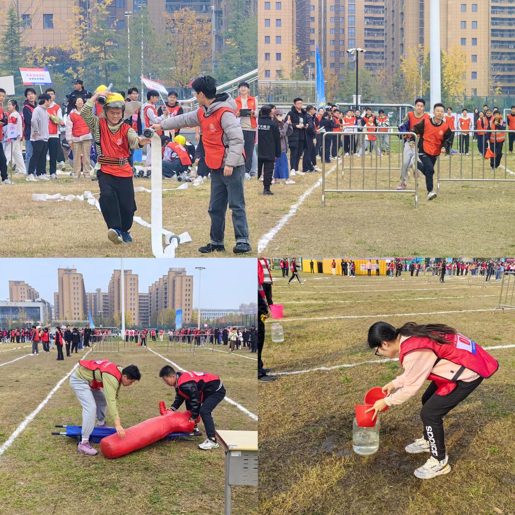 在水带接力项目中王浩天、吴延熙快速将水带抛出并连接好后,袁核从起点携带水枪喷头出发,冲刺到赛道末端时丁思丹迅速穿上消防服,完成了“灭火”的工作。烟雾灭火项目中余思滢、陈泽文仔细观察后果断行动,在烟雾弥漫的消防逃生帐篷中找到出口并迅速去扑灭消防模拟火源。张伟、赵佳晟、刘文慧参加的障碍救援项目中,大家团结协作克服障碍,迅速救出被困人员,取得所在小组第二名的优异成绩。在危急时刻项目中,宁雅云、陈佳琪、颜佳婧三位同学穿越布满障碍的赛道将水桶灌满。