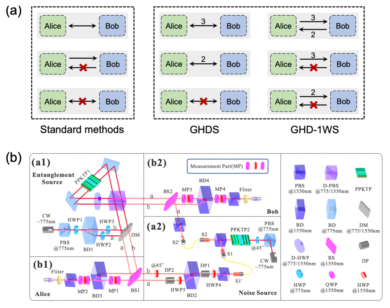 图(a)高维单向量子导引新结构;(b)基于路径-偏振自由度高维纠缠系统的实验观测装置