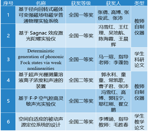 2024年7月28-30日,第十二届全国高等学校物理实验教学研讨会在江西九江圆满结束,全国物理教学实验仪器评比与学生论文评比同期顺利举办。我校师生奋力拼搏,通过全国初评-复评-终评层层选拔,喜获六项国家级奖励:教师自制仪器报送4项作品,获全国一等奖2项(普通物理实验1项,近代物理实验1项),全国二等奖2项(普通物理实验1项,近代物理实验1项);本科生论文报送2篇,物理试验班21级马一瑄获得全国一等奖(科研论文组第一名),物理强基21级李博涵获全国二等奖(教学论文组)。实现了我校在该赛事自制教学实验仪器全国一等奖的获奖类型全覆盖;学生论文评比获奖数量再创新高;整体成绩在C9高校名列前茅。