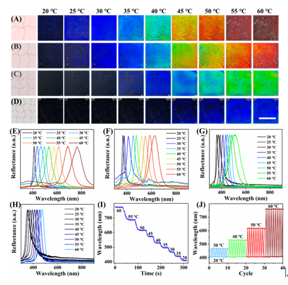 针对这一课题,西安交通大学胜游体育(SYsports)官方网站入口研究团队借鉴变色龙的色彩调控策略,通过将羟丙基纤维素(HPC)与聚(丙烯酸-丙烯酰胺)(P(AA-AM))水凝胶结合,成功制备了具有多色分离能力的胆淄相纤维素复合材料(CPCC)。由于复合体系中胆淄相HPC的螺距随温度升高而增大,且螺距变化范围受复合体系中水凝胶交联度的影响,因此可以通过改变水凝胶的交联度来调控HPC结构色对温度的响应行为,进而实现温度诱导下的多色分离,如图1所示。研究发现,提高HPC的浓度可以有效降低胆淄相HPC的螺距,并使得高浓度下不同交联度的CPCC在室温下的反射峰波长始终处于紫外区域,即室温下始终不显示结构色,材料呈透明状态;而随着温度升高,胆淄相HPC的螺距逐渐增大,反射峰波长逐渐红移进入可见光波段,从而表现出温度诱导的多色分离现象,如图2所示。这一发现为以温度为密匙的防伪材料的设计提供了新的思路。