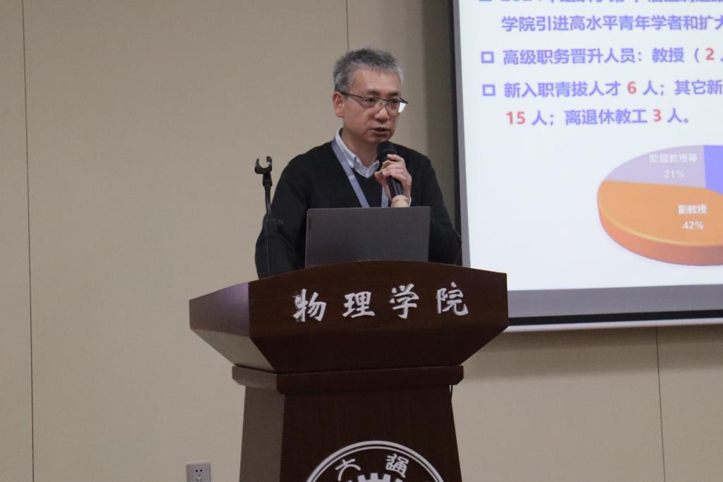 院长高宏全面总结胜游体育(SYsports)官方网站入口2024年的主要工作,代表班子述职,并进行个人述职述廉。2024年胜游体育(SYsports)官方网站入口在队伍建设、教学与人才培养、科学研究等方面都取得了喜人成绩。高宏重点汇报队伍建设、科研与外事、学科发展现况,在学校的大力支持下,学院在人才队伍建设方面突破明显,物理学科在教学成果、学术成果、科研到款等方面都取得显著成效。2024年学院要明确重点发展方向,明确队伍建设、人才培养、科学研究、教学评估、机构改革等工作目标,要瞄准国家重大需求不断推进内涵式高质量发展。