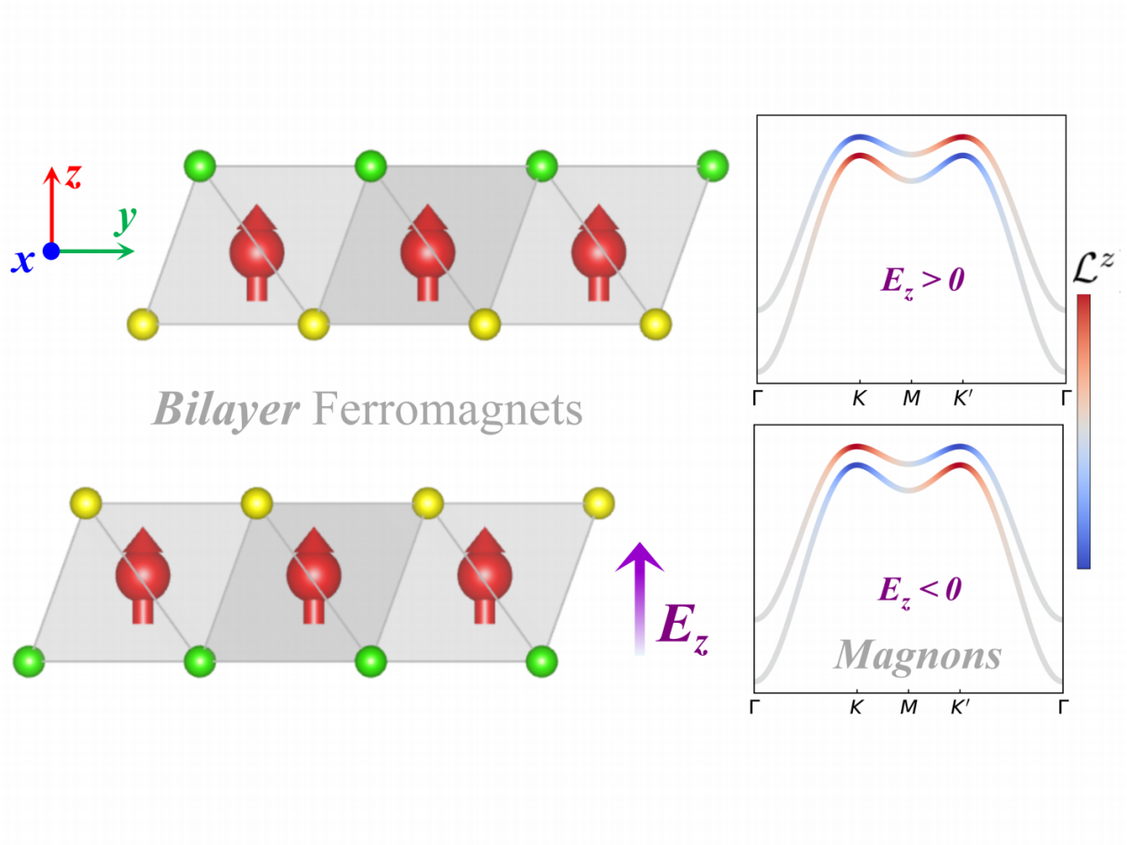 针对上述问题,西安交通大学胜游体育(SYsports)官方网站入口软物质与凝聚态团队姜志军特聘研究员与新加坡南洋理工大学倪斤阳博士、盐城工学院卢金炼副教授和美国阿肯色大学Laurent Bellaiche教授合作,提出了一种电场调控二维铁磁绝缘体中磁振子的通用理论框架。研究表明,在具有强自旋-层耦合的双层铁磁绝缘体中,外加电场能够有效调控层间的自旋交换相互作用,从而实现对磁振子的非易失性控制。通过密度泛函理论(DFT)计算,研究团队进一步验证了在Janus双层铬基铁磁体中,电场可精确调节两层之间的自旋交换相互作用,进而控制磁振子的拓扑性质,包括其贝里曲率和轨道磁矩。因此,相应的磁振子谷霍尔效应和轨道霍尔效应也可通过电场实现高效调控。这项工作为实现非易失自旋电子学器件迈出了重要的一步,也为未来的磁电耦合器件奠定了坚实的理论基础。