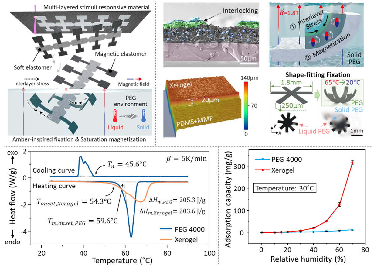 针对这一问题,西安交通大学胜游体育(SYsports)官方网站入口先进功能材料与器件物理团队青年优秀教师韩捷等受“琥珀固化”现象的启发,提出了一种无需模板的三维磁畴编程新策略。团队构建了由干凝胶、激光诱导石墨烯(LIG)与磁弹性体组成的三层异质材料体系,利用其三维互联微孔道结构,实现超亲水-超疏水界面的稳定连接。干凝胶层在温/湿场中收缩,诱发层间应力,从而驱动微结构实现精确三维变形。随后采用高精度的飞秒/皮秒激光加工技术,实现逐层构型与应力编程图案化,特征尺寸优于20μm,具备秒级制备效率。最终在饱和磁场下完成磁化,并通过水洗去除PEG和干凝胶层,成功实现了微型磁控软体机器人的一致性、批量化制备。该研究不仅提出了一种全新的磁畴编程范式,同时为物理智能微型机器人在生物医疗、微流控及智能集群等领域的应用奠定了基础。