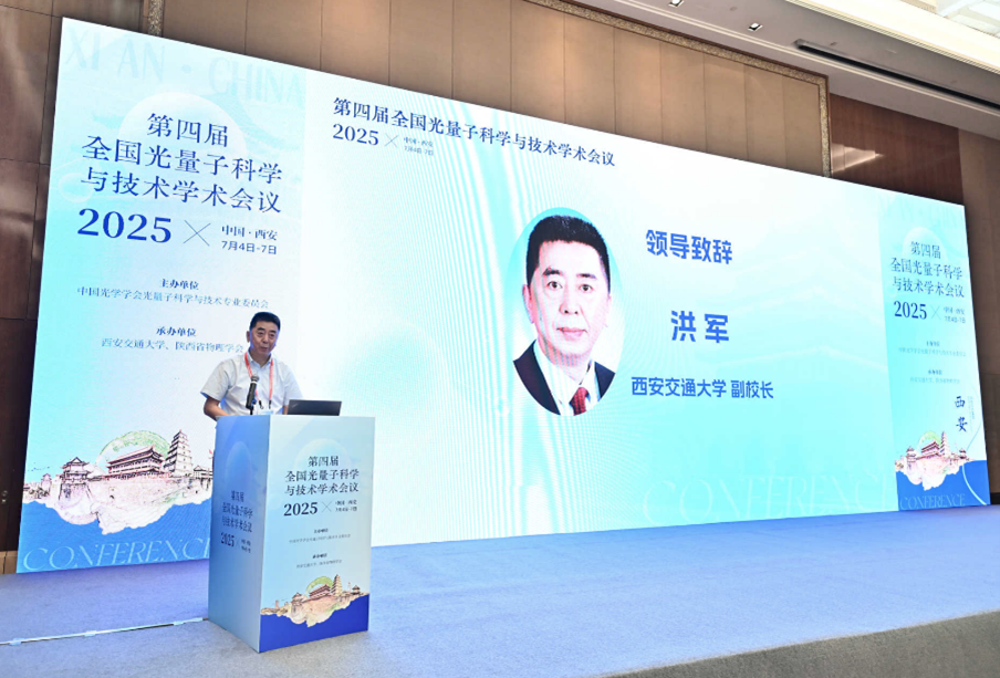 洪军副校长在开幕式上代表西安交通大学致欢迎辞。他首先对与会嘉宾表示热烈欢迎和衷心感谢。他指出,当前光量子科学与技术作为前沿科技的战略制高点,抢占量子科技制高点已成为发展新质生产力、赢得未来竞争优势的关键。他介绍了西安交通大学服务国家战略、在物理电子信息等领域积累深厚、布局量子科技核心研究方向、汇聚优秀团队并广泛开展合作的情况。他希望本次会议能成为交流前沿成果、探讨深层挑战、激荡创新思想的平台,并催生新合作、开辟新方向,有力推动领域取得新突破。他预祝会议圆满成功,并祝愿与会代表在西安度过充实愉快的时光。