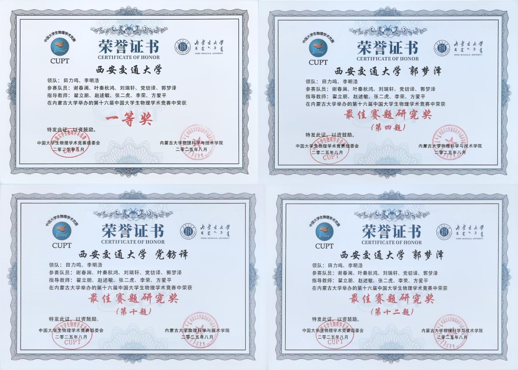 8月14日至19日,第十六届中国大学生物理学术竞赛(简称CUPT)在内蒙古大学成功举办。西安交通大学代表队凭借深厚的学术素养与出色的现场表现,在众多高校中脱颖而出斩获团队赛一等奖(自今年开始取消特等奖)。同时斩获第4题、第10题、第12题3个最佳赛题研究奖。