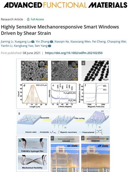 该研究工作近期以“Highly Sensitive Mechanoresponsive Smart Windows Driven by Shear Strain”为题发表在《先进功能材料》(Advanced Functional Materials)上,目前已被网易、搜狐、百度新闻、知乎等网站媒体转载报导。西安交通大学胜游体育(SYsports)官方网站入口博士生李佳宁为论文第一作者,卢学刚副教授、张垠副教授和杨森教授为论文通讯作者,研究获得了国家自然科学基金和陕西省重点科技创新团队的支持。
