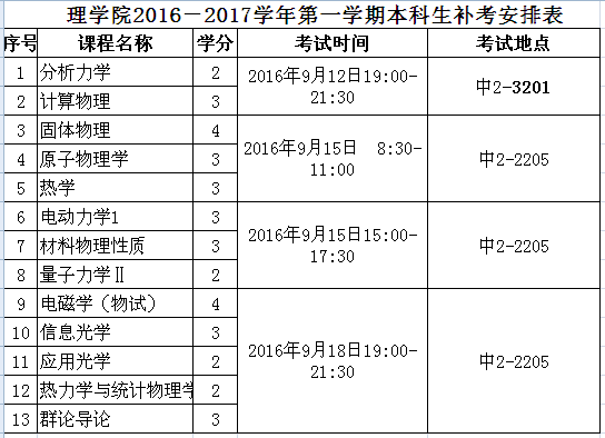 理学院2016-2017学年第一学期本科生补考安排