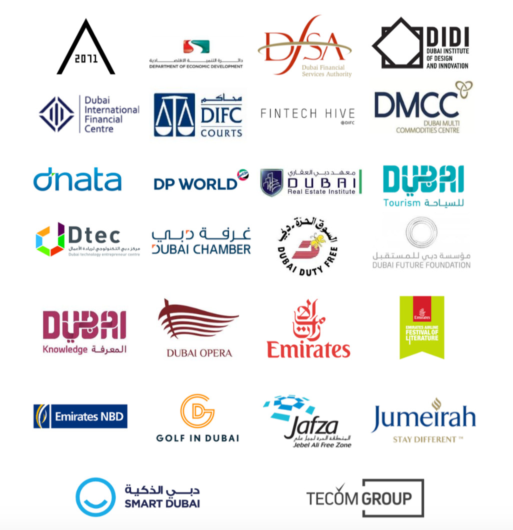 项目合作伙伴包括: Emirates Airline、Emirates NBD、Dubai International Financial Center、Jumeirah、Dubai Financial Service Authority、Dubai Chamber、Emirates Airline Festival of Literature、Jafza、DP World、2071、DIFC Court、Tecom Group、Fintech Hive、Smart Dubai、Dubai Golf、Dubai Future Foundation、Al Jalila、Foundation、Dubai Knowledge、Dubai Tourism、DMCC、Dubai Opera等知名国际企业。