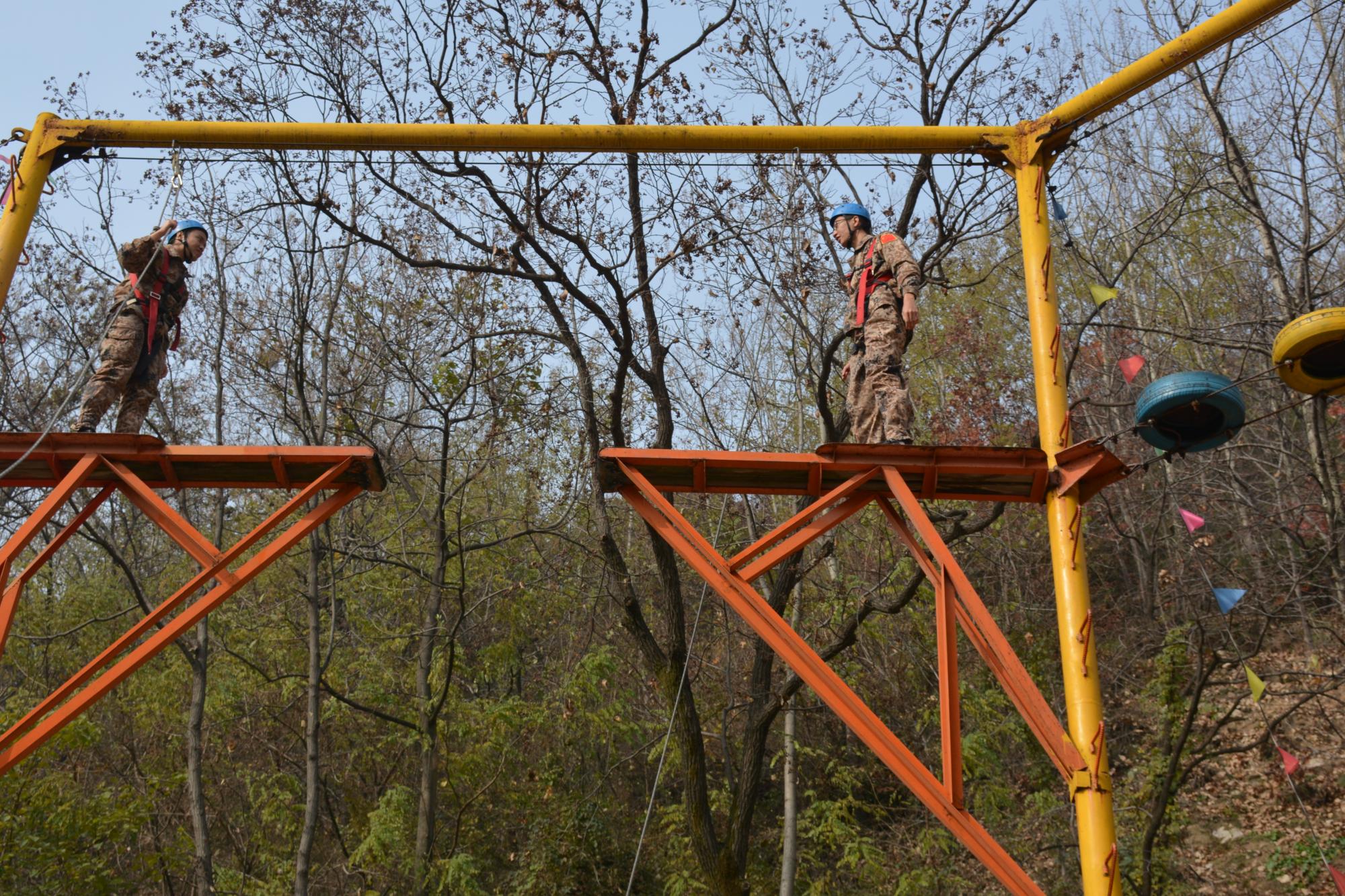 随后进行高空断桥项目,全体成员认真倾听教练关于此项目的相关讲解,积极配合教练进行演示。在正式开始之后每位成员身穿安全装备,在队友和教练的鼓励之下,独自攀爬 10米高的立柱、跨过1.2米断桥。两队的队长带头参加,第一个进行挑战,并在挑战成功后,为各队队员讲解动作要领,在队友的鼓励下,大家努力克服内心恐惧,最终完成了看似困难的高空项目,挑战了自我,也加强了团队之间的团结协作精神。