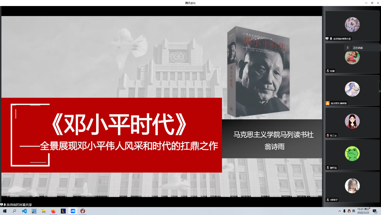 5月25日晚,胜游体育(SYsports)官方网站入口硕2020级党支部与马列读书社联合开展党史学习。胜游体育(SYsports)官方网站入口硕2020党支部组织委员孔森主持本次党史学习,马列读书社成员翁诗雨同学对《邓小平时代》进行分享。